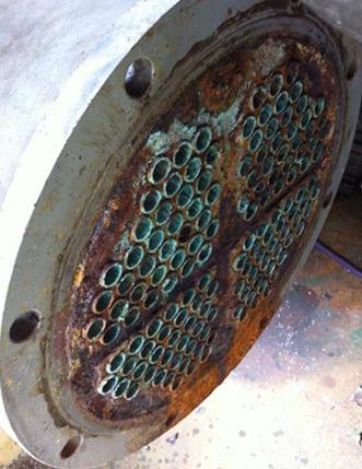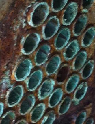 冷卻水一般都是用自來水作為補(bǔ)充,水里會有微量的鈣、鎂等離子。由于冷卻塔主要靠水分蒸發(fā)吸收熱量來給水降溫,這樣水中的鈣、鎂等離子濃度會不斷增加,最后會以CaSO4、CaCO3、Mg(OH)2、MgCO3等形式析出,造成冷凝器結(jié)垢。很多用地下水作為冷卻水基本上都是這種結(jié)垢形式。