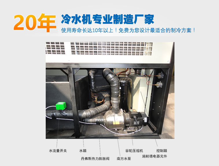 9)冷水機采用人性化設計,其冷量充足且體積小、結(jié)構合理、外型美觀、操作方便。