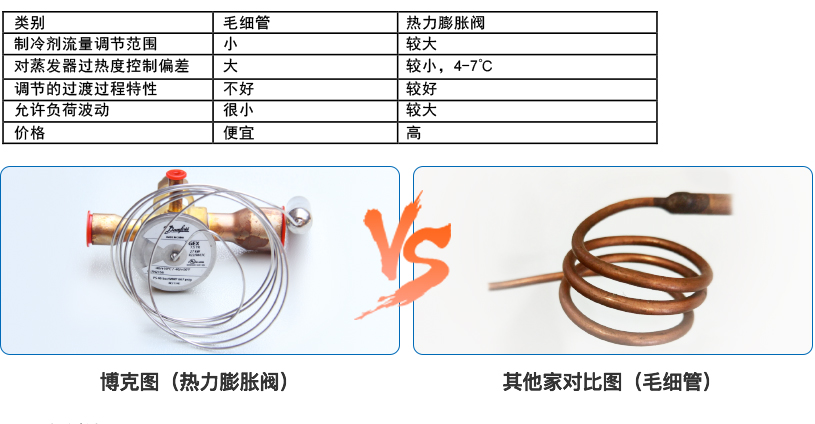 3、博克節(jié)流閥采用丹弗斯/艾默生外平衡熱力膨脹閥控制,溫度調(diào)節(jié)范圍廣,制冷劑流量自動(dòng)控制,機(jī)組運(yùn)行十分穩(wěn)定,能效比優(yōu),與目前市場(chǎng)上普遍采用的毛細(xì)管節(jié)流相比,具有無(wú)可比擬的優(yōu)越性。當(dāng)工況如環(huán)境溫度、要求的水溫、熱負(fù)荷等變化時(shí),毛細(xì)管無(wú)法自我調(diào)節(jié),此時(shí)制冷量下降,同時(shí)可能會(huì)造成壓縮機(jī)排氣溫度過(guò)高、潤(rùn)滑性下降或液擊,直接影響機(jī)組的使用壽命,嚴(yán)重時(shí)制冷系統(tǒng)無(wú)法正常工作。