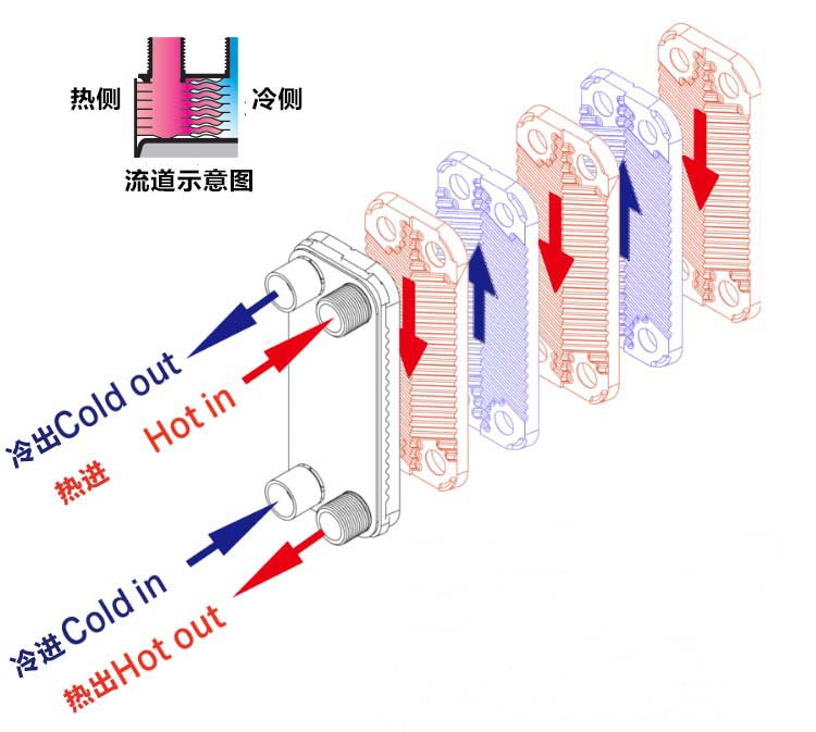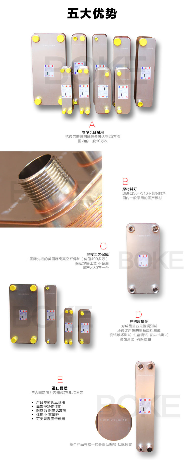 高力釬焊板式換熱器是由沖壓成形的山形波紋板片組成。根據(jù)不同的工況用途,使用不同的板紋設(shè)計和釬料將板片焊接成為板式熱交換器,并能在高溫高壓的工作系統(tǒng)中發(fā)揮高效率的熱傳性能,以達到節(jié)約能源的功效。