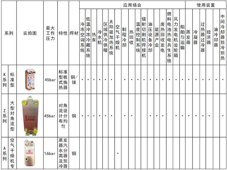 適用流體:各種冷媒、氨水(鎳焊型)、有機體溶液、水、油、各種鹵水溶液(乙二醇、酒精)