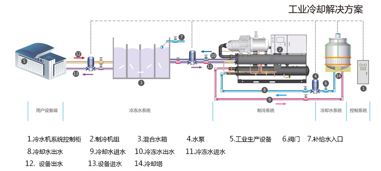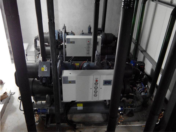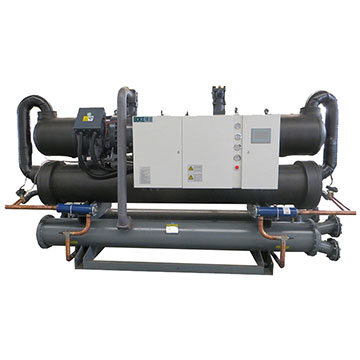 1)水冷螺桿式低溫冷水機(jī)組是以半封閉雙螺桿壓縮機(jī)為核心,以制冷劑為載體,制冷時(shí)以水為冷源,將負(fù)載側(cè)的熱量通過制冷循環(huán)釋放到冷源,從而對負(fù)載側(cè)進(jìn)行降溫。