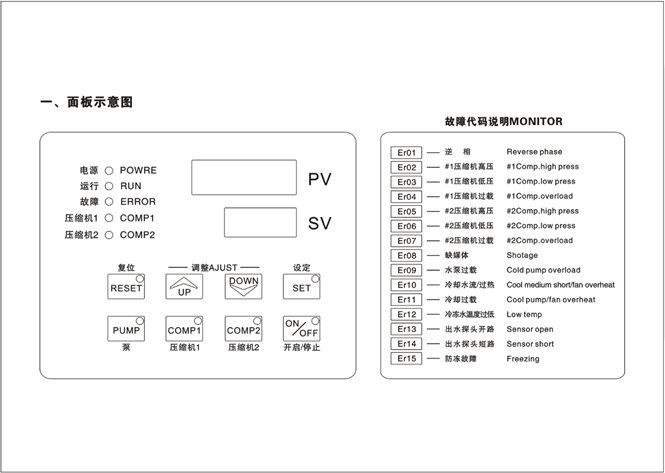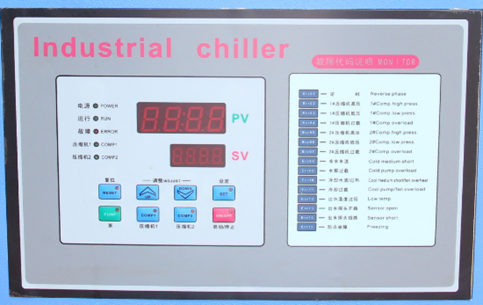 3)微電腦溫度自動(dòng)控制。逆相、壓縮機(jī)高壓、壓縮機(jī)低壓、壓縮機(jī)過載、水泵過載、冷卻水流/過熱、冷凍水溫過低、防凍等故障均會(huì)在面板顯示。面板顯示溫度設(shè)定值及當(dāng)前溫度值。外形美觀,設(shè)置方便。