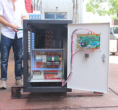 1)本機組作為電磁烘干爐的一部分配套使用,受空間限制,冷水機采用風(fēng)冷式,是按客戶的尺寸、顏色和控制要求定制的,設(shè)有遠程開、停機功能。