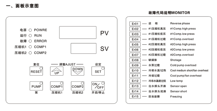 5)所有故障有故障報(bào)警信號(hào)輸出,面板上均有代碼顯示,在說明書及控制箱內(nèi)均由代碼說明(冷媒高壓、冷媒低壓、逆相、壓縮機(jī)過載、內(nèi)外循環(huán)水泵過載、風(fēng)機(jī)過載、介質(zhì)流量低、水溫高)。